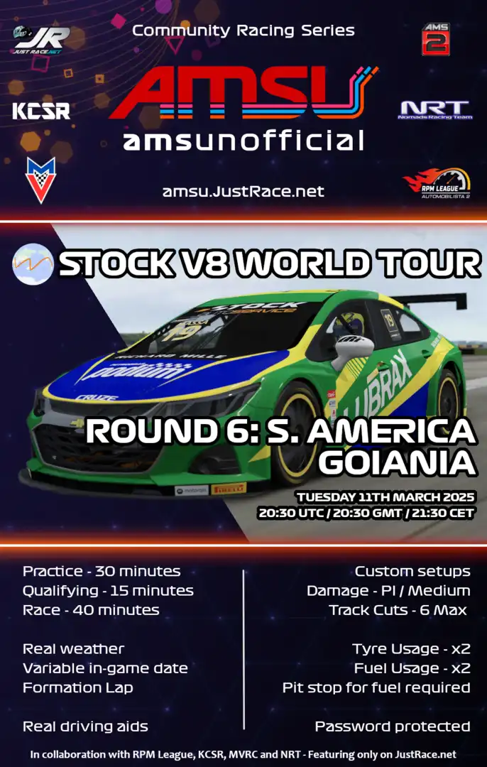 Join AMSUnofficial for some championship racing in Automobilista 2! Round 6 of 6 is on Tuesday, March 11, 2025 at 8:30 PM UTC with StockCarV8_2022 at Goiânia.